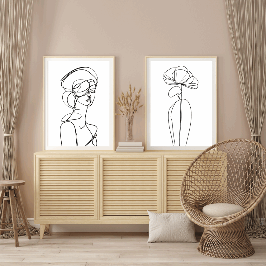Najprościej zacząć od jednego większego plakatu i dobrać do niego mniejsze w podobnej stylistyce. Świetnie wyglądają zestawy botaniczne, minimalistyczne oraz plakaty czarno-białe. Na blogu znajdziesz inspiracje i gotowe układy do odtworzenia.