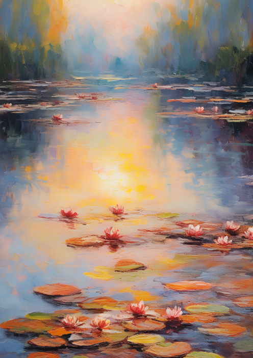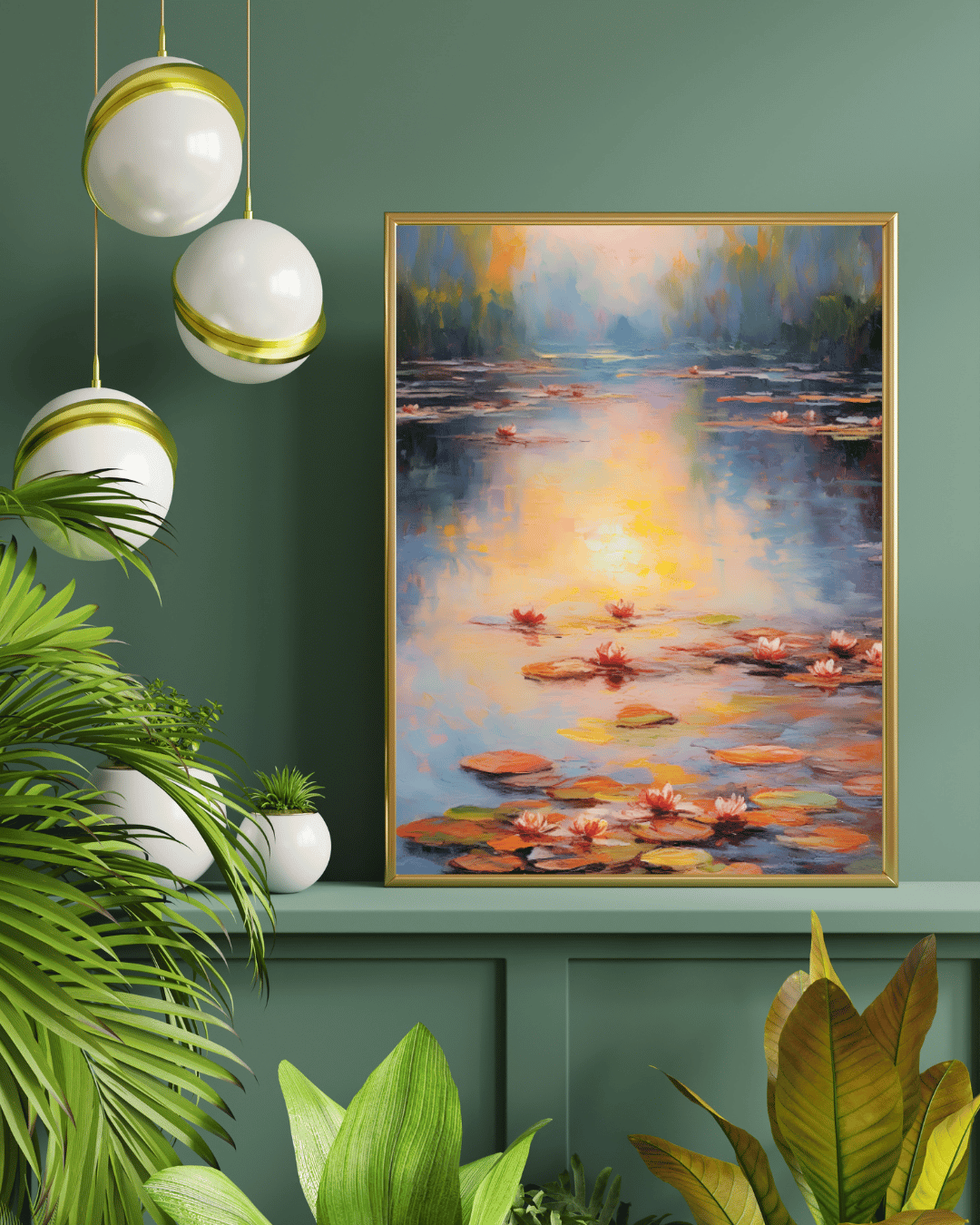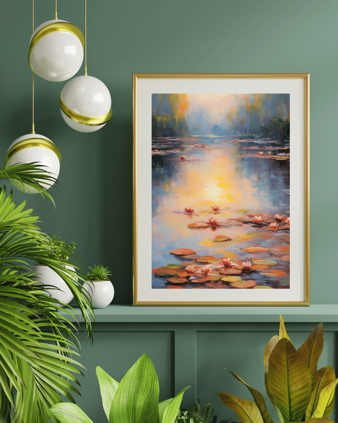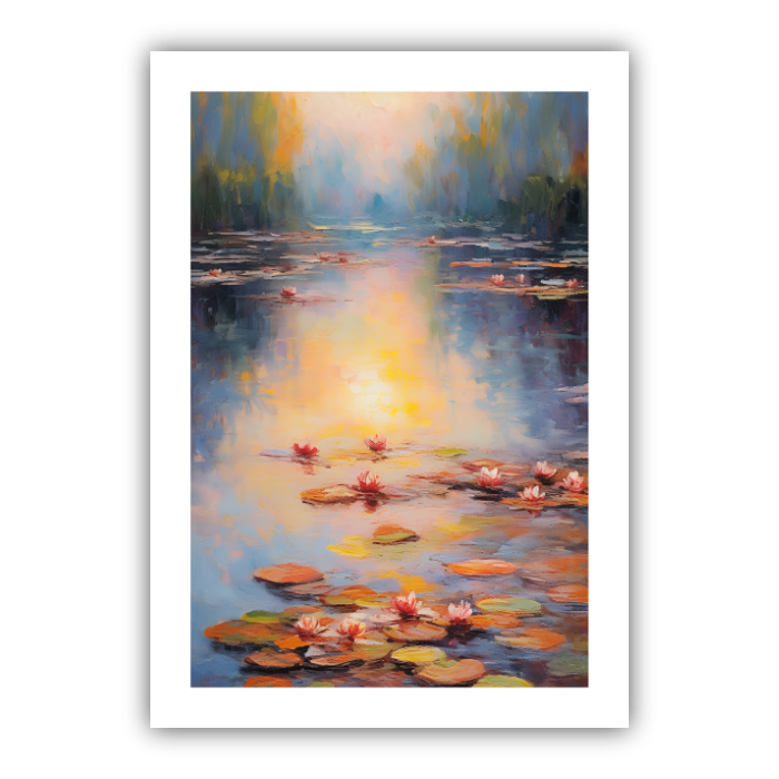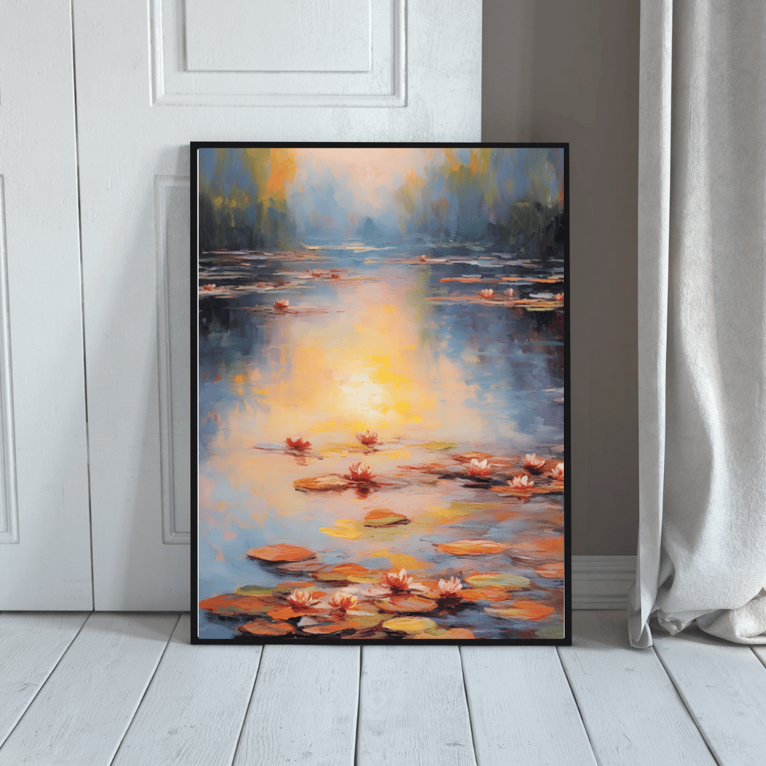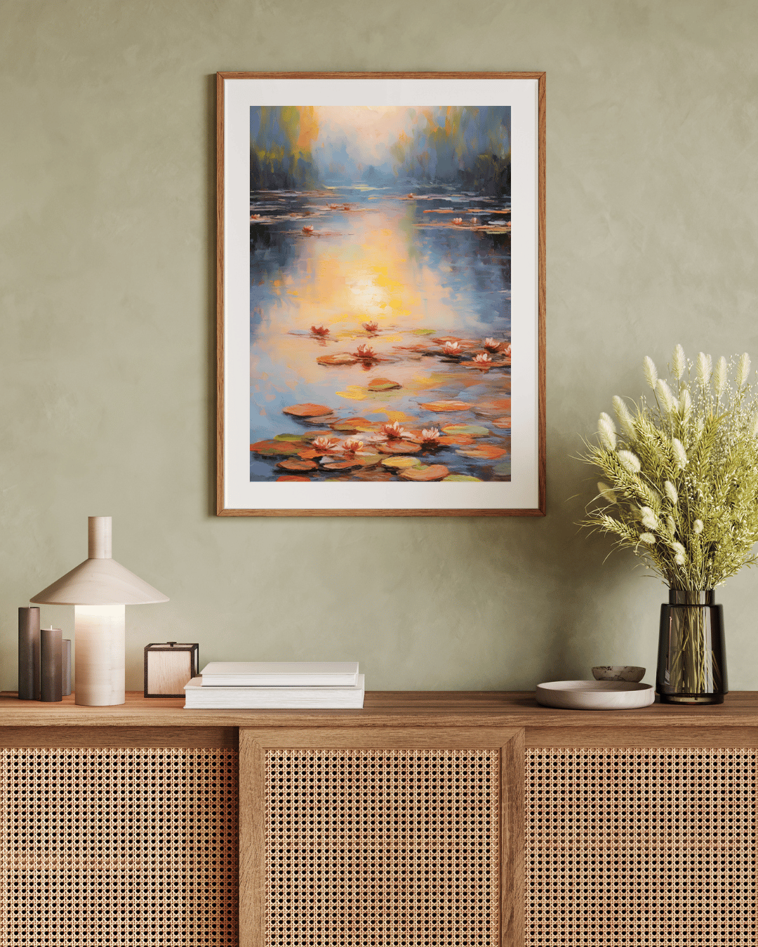 Ten plakat przedstawia spokojną taflę jeziora pokrytą liliami wodnymi, skąpaną w ciepłym, złotym świetle. Miękkie przejścia kolorów i widoczna faktura pociągnięć pędzla sprawiają, że grafika wygląda jak ręcznie malowany obraz i wprowadza do wnętrza atmosferę harmonii oraz relaksu.