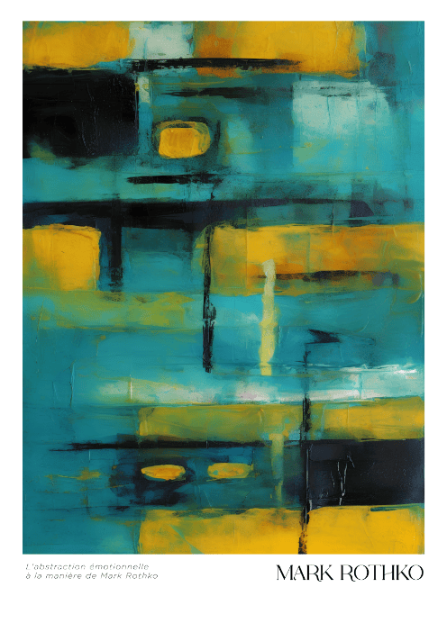 Ten plakat inspirowany Markiem Rothko to hołd dla mistrzowskiego wykorzystania koloru. Kompozycja w odcieniach turkusu, głębokiej czerni i intensywnej żółci przyciąga wzrok, tworząc emocjonalną równowagę między spokojem a ekspresją. Nawiązuje do stylu color field painting – skupiającego się na odczuciach, nie na formach. Idealnie sprawdzi się jako mocny akcent w nowoczesnym wnętrzu.