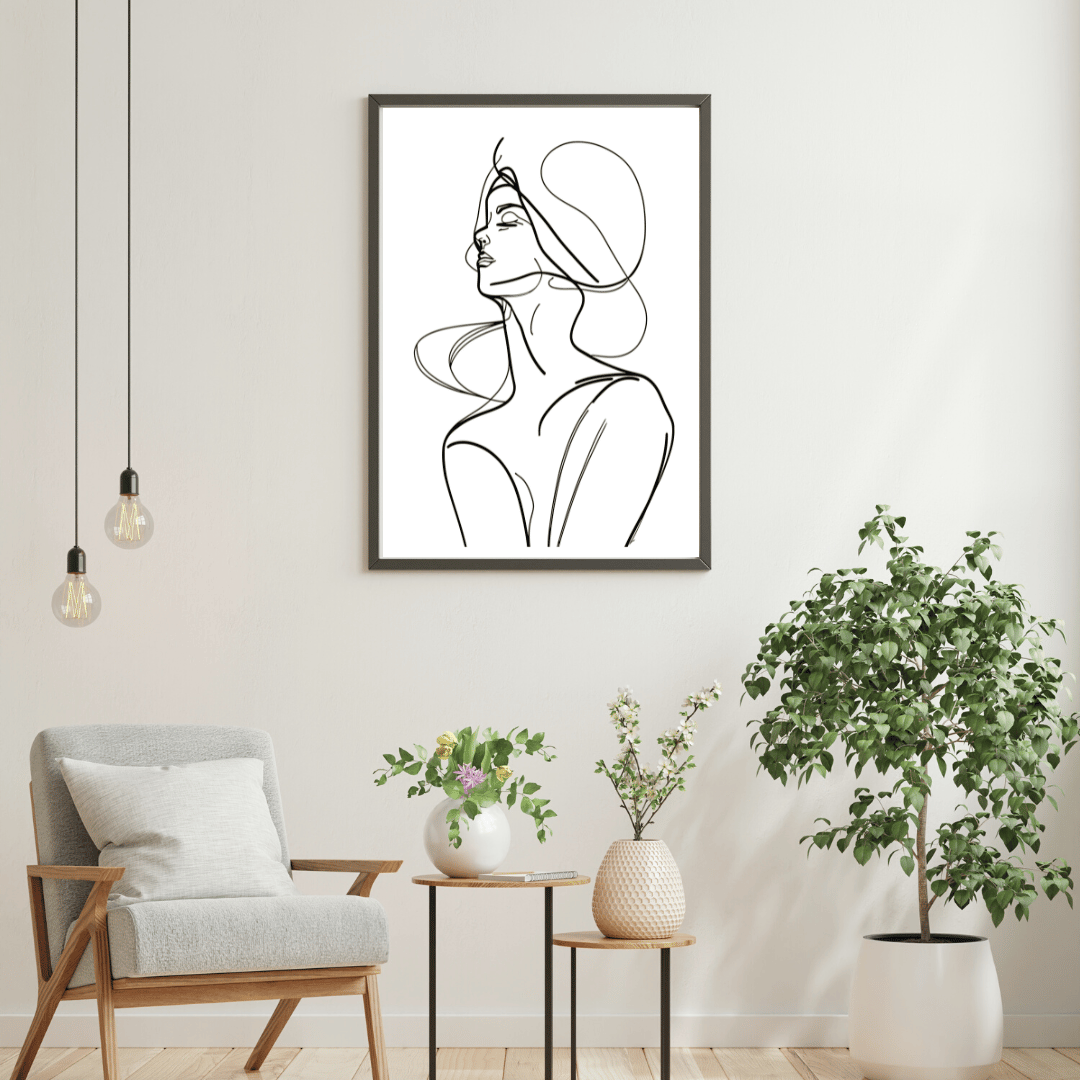 Plakat doskonale sprawdzi się jako dekoracja do salonu, sypialni, garderoby, przedpokoju lub stylowego biura. Może być samodzielnym akcentem lub częścią spójnej galerii ściennej z plakatami line art i minimalistycznymi ilustracjami.