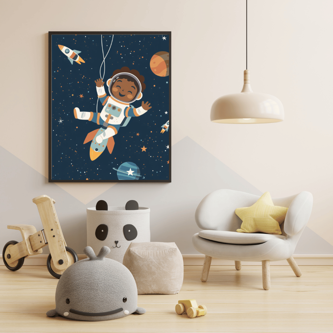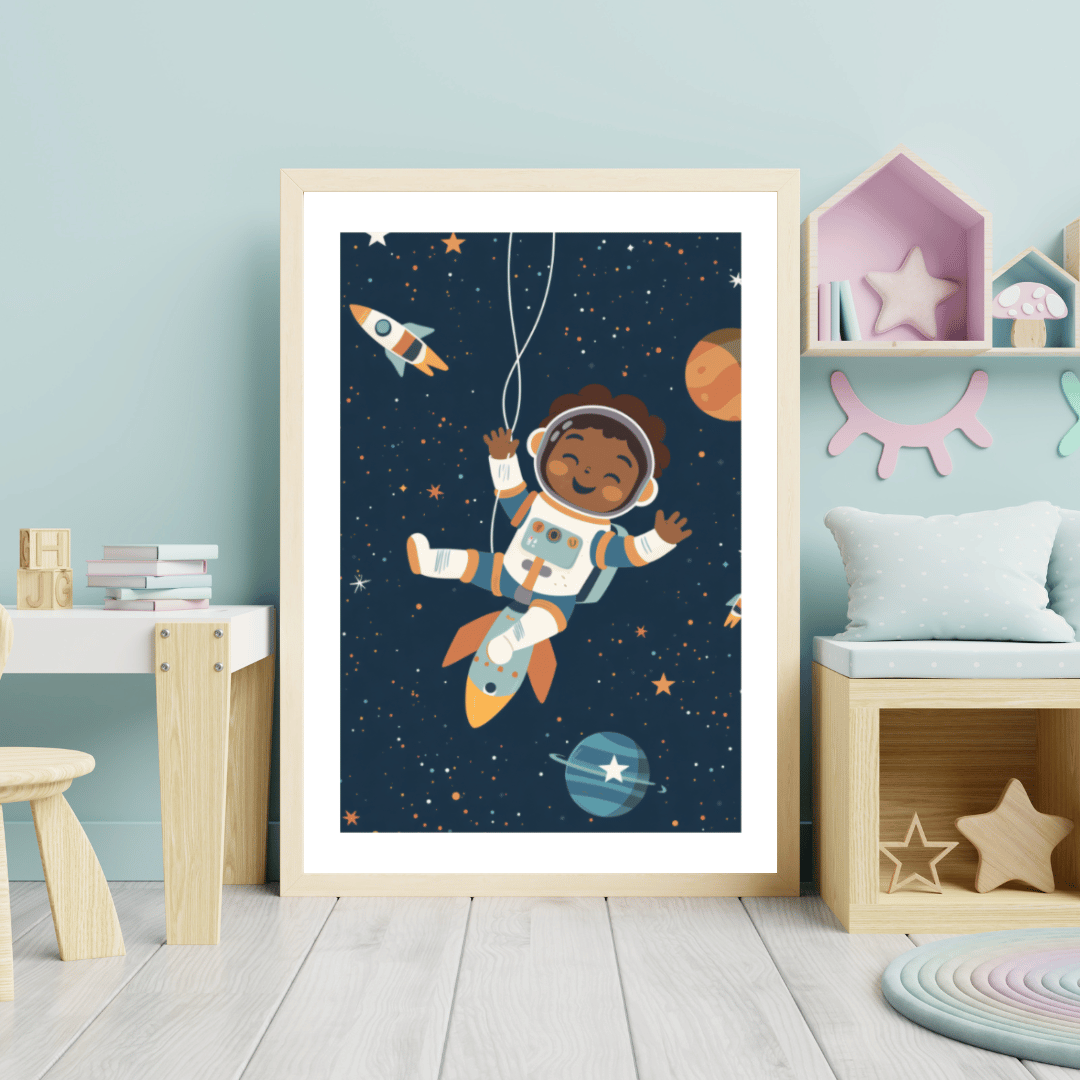 Plakat świetnie wygląda w zestawie z innymi grafikami z motywem planet, rakiet i gwiazd. Kilka plakatów w podobnej kolorystyce pozwoli stworzyć spójną galerię ścienną, która całkowicie odmieni dziecięcy pokój i stworzy wyjątkowy, tematyczny klimat.