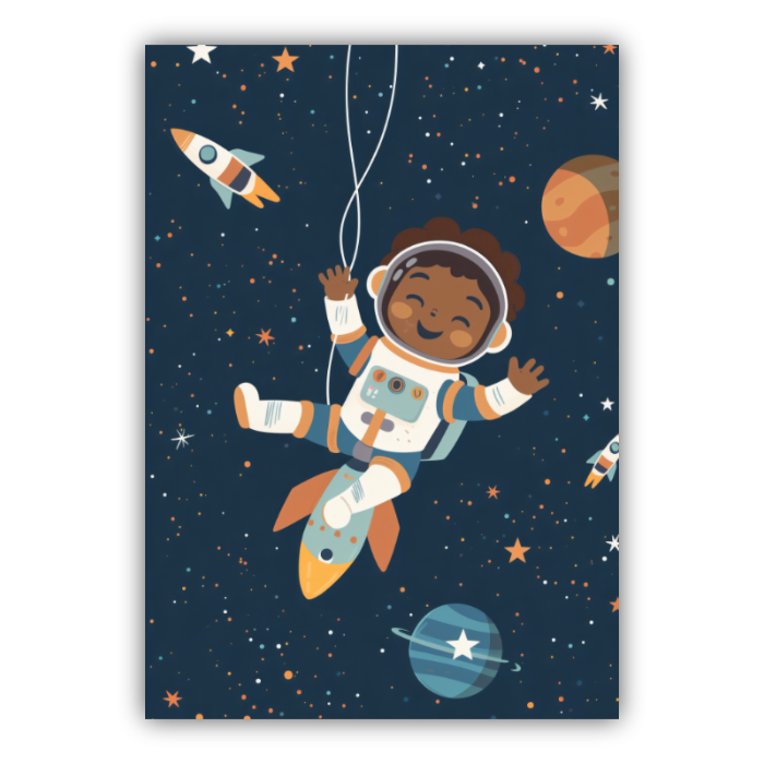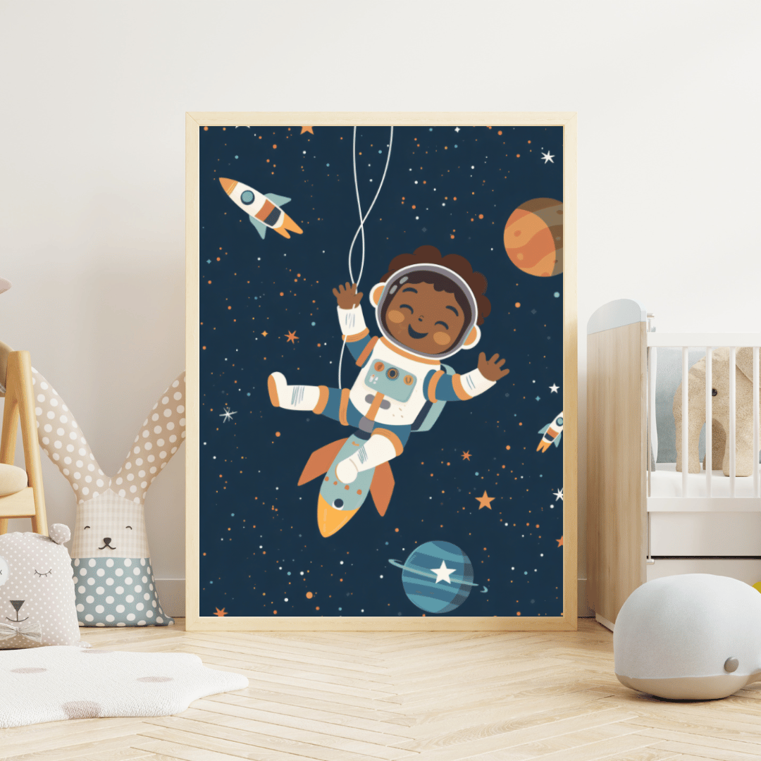 Ten kolorowy plakat z uśmiechniętym astronautą to idealna dekoracja do pokoju dziecka, która zamienia zwykłą ścianę w pełną przygód kosmiczną przestrzeń. Wesoła postać, rakiety, planety i gwiazdy tworzą dynamiczną, radosną scenę, która pobudza wyobraźnię i zachęca do odkrywania świata.