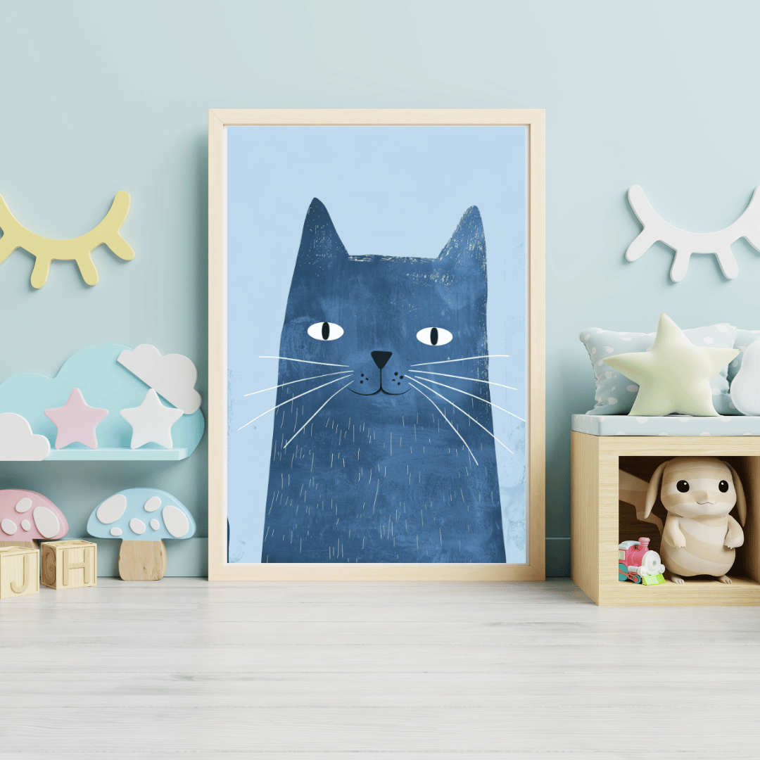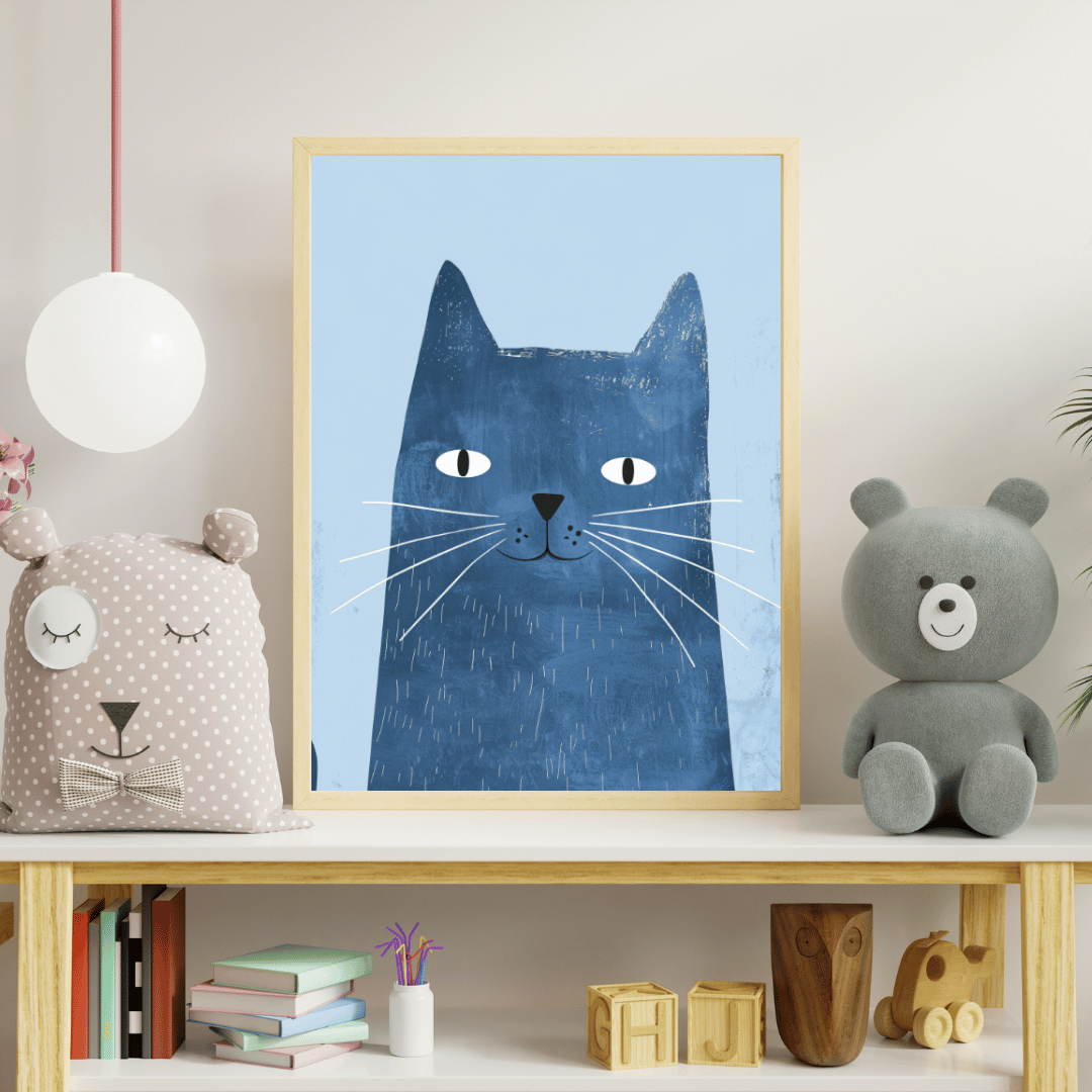 Plakat z ilustracją niebieskiego kota to spokojna i urocza dekoracja do pokoju dziecka. Prosta forma, delikatna faktura i stonowana kolorystyka sprawiają, że plakat jest przyjemny dla oka i łatwo dopasowuje się do dziecięcych wnętrz.