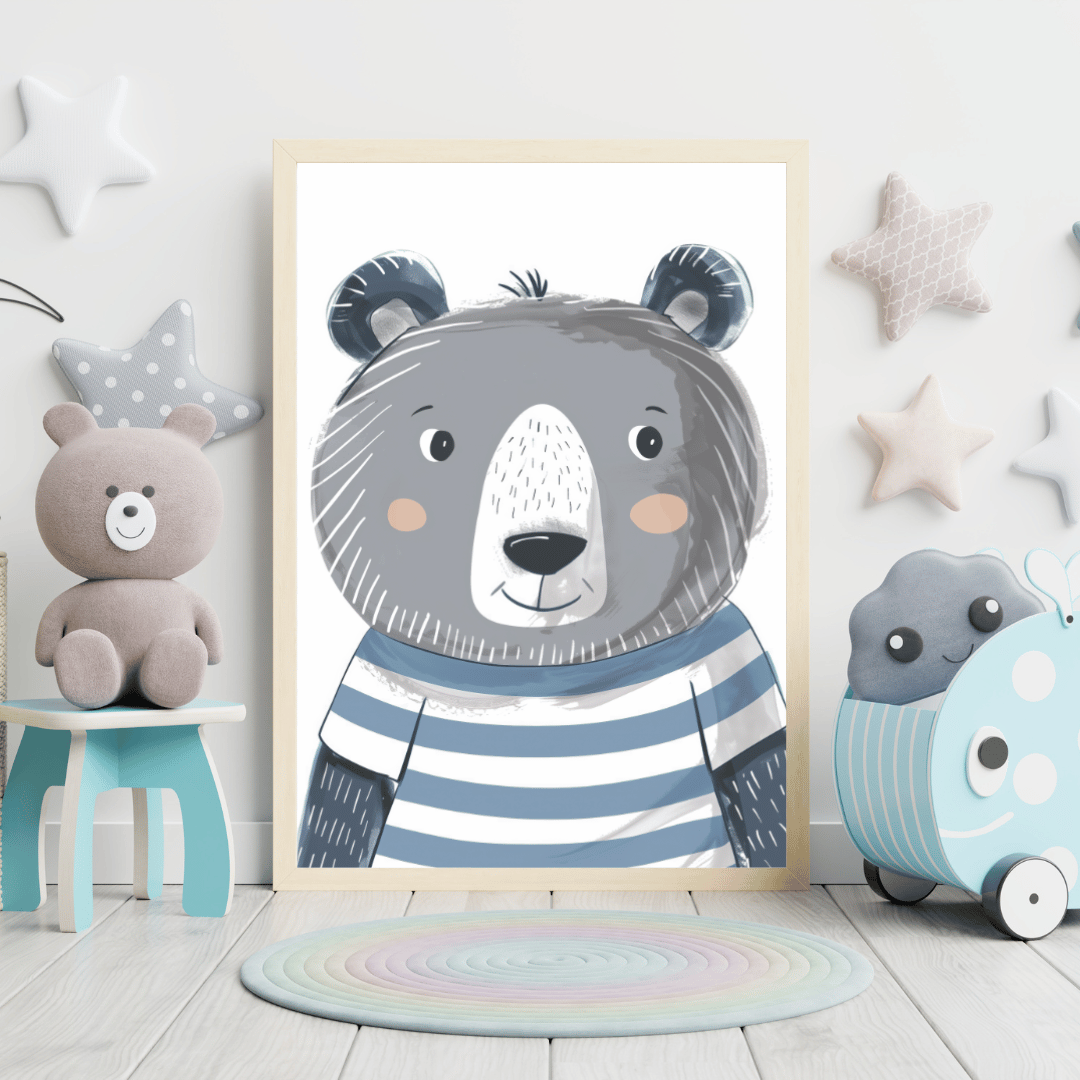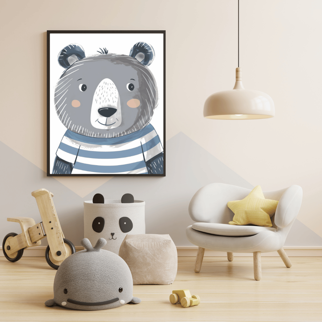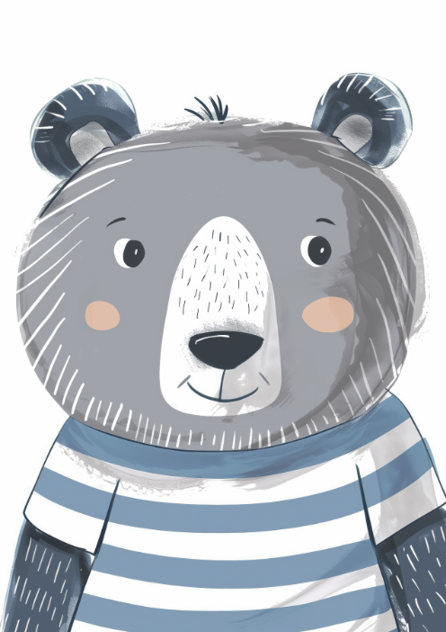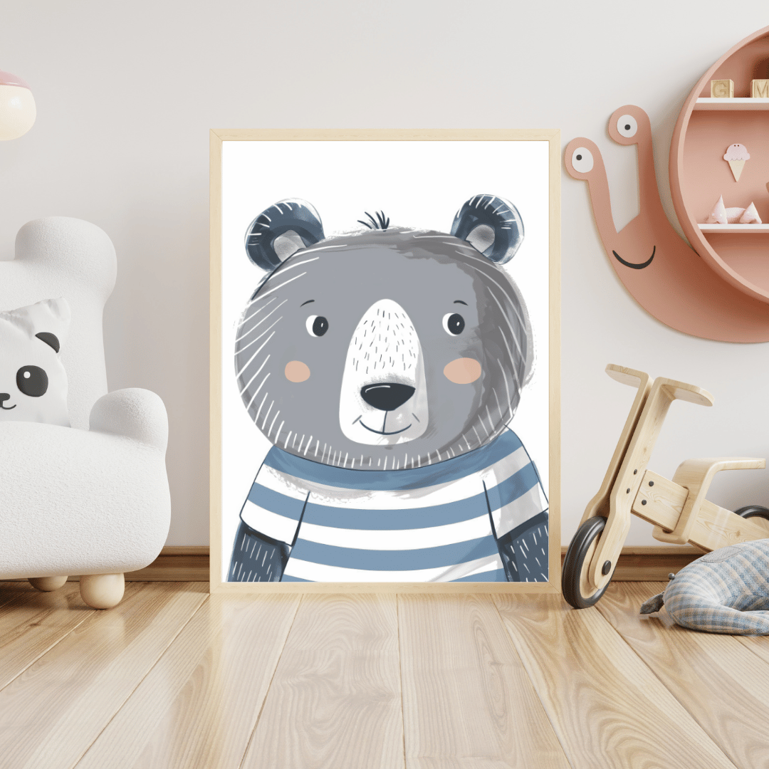 Plakat z ilustracją uśmiechniętego misia w pasiastym sweterku to przyjazna i spokojna dekoracja do pokoju dziecka. Stonowana kolorystyka w odcieniach szarości, błękitu i bieli sprawia, że plakat jest delikatny dla oka i łatwo dopasowuje się do dziecięcych wnętrz.