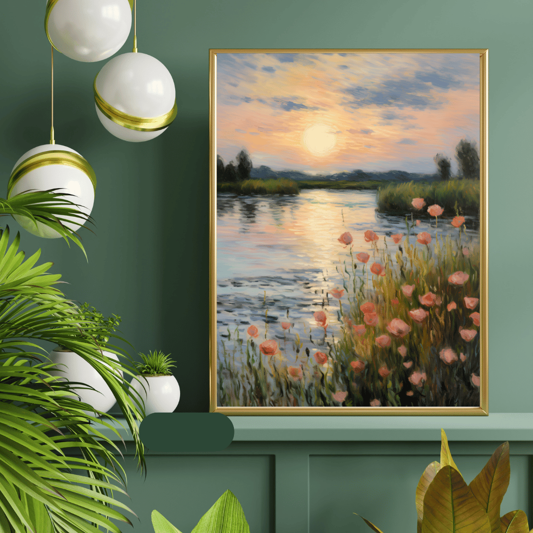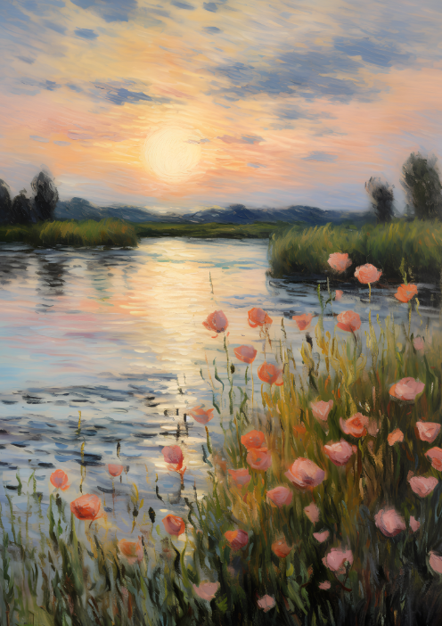 Plakat pejzaż z kwiatami nad wodą o zachodzie słońca – styl malarski