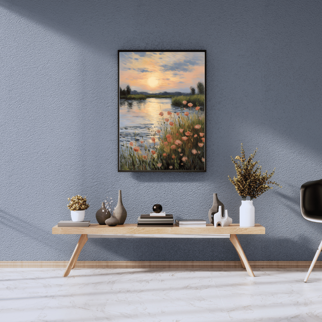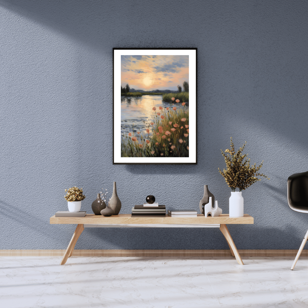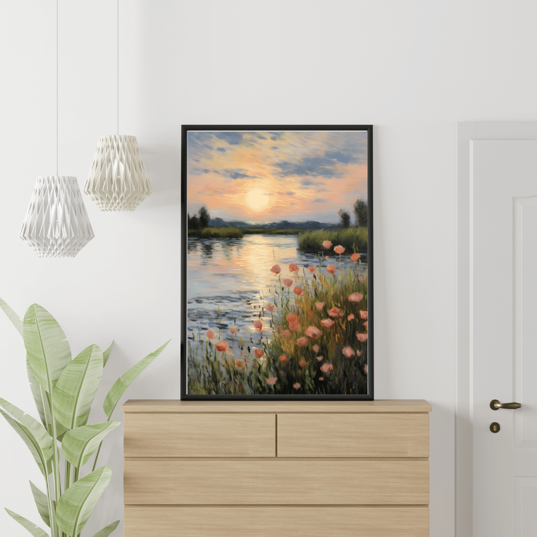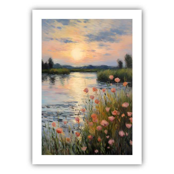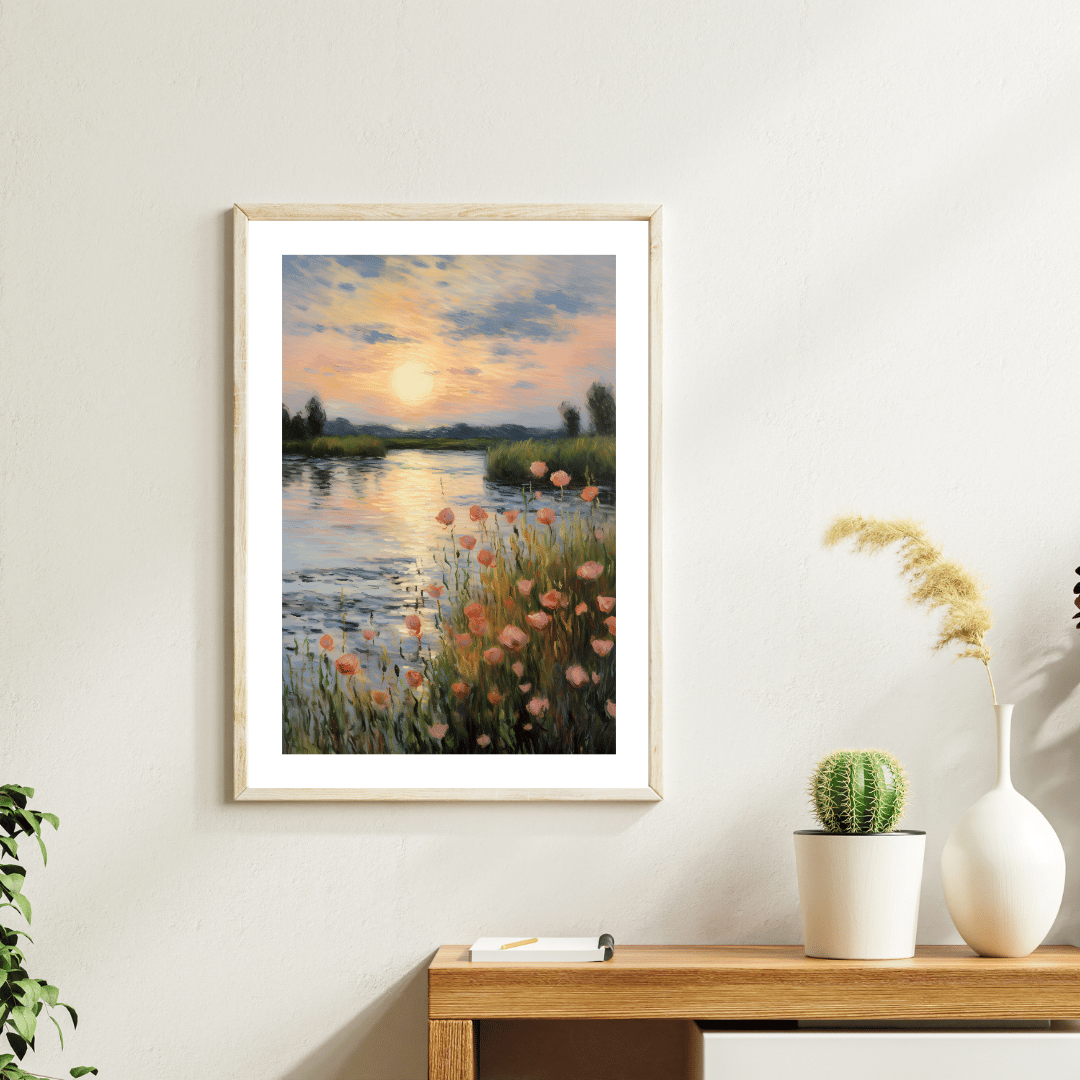 Ten wyjątkowy plakat przedstawia spokojny krajobraz nad wodą skąpany w ciepłym blasku zachodzącego słońca. Delikatne kwiaty na pierwszym planie, miękkie odbicia światła na tafli wody oraz pastelowe niebo tworzą kompozycję pełną harmonii i ciszy, która doskonale uspokaja i buduje przytulny klimat we wnętrzu.