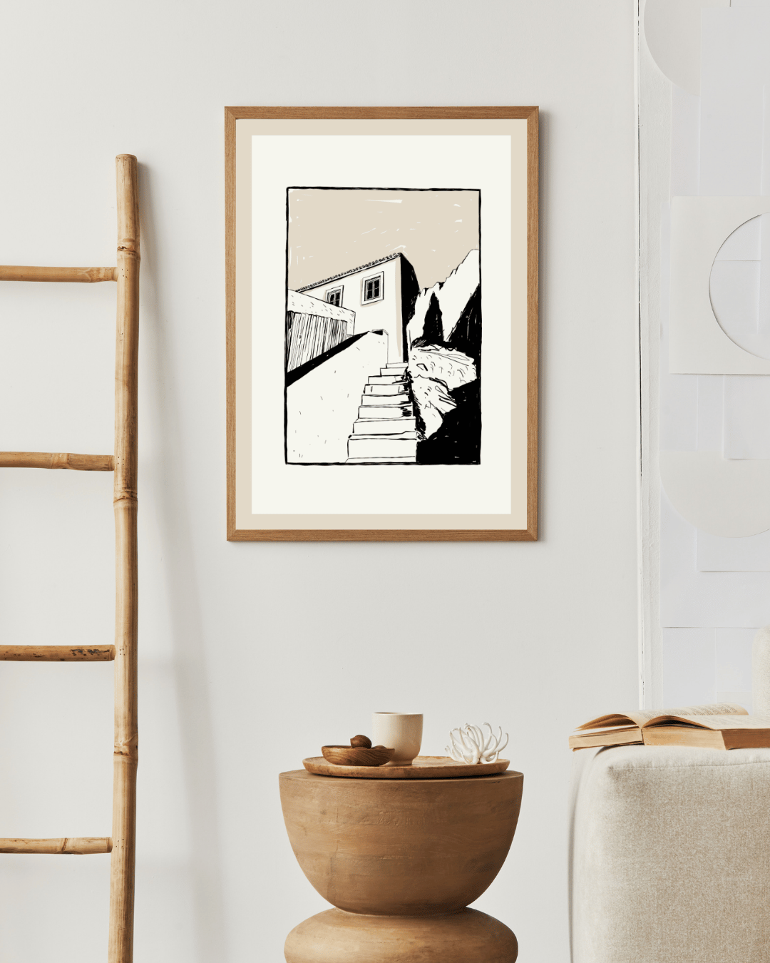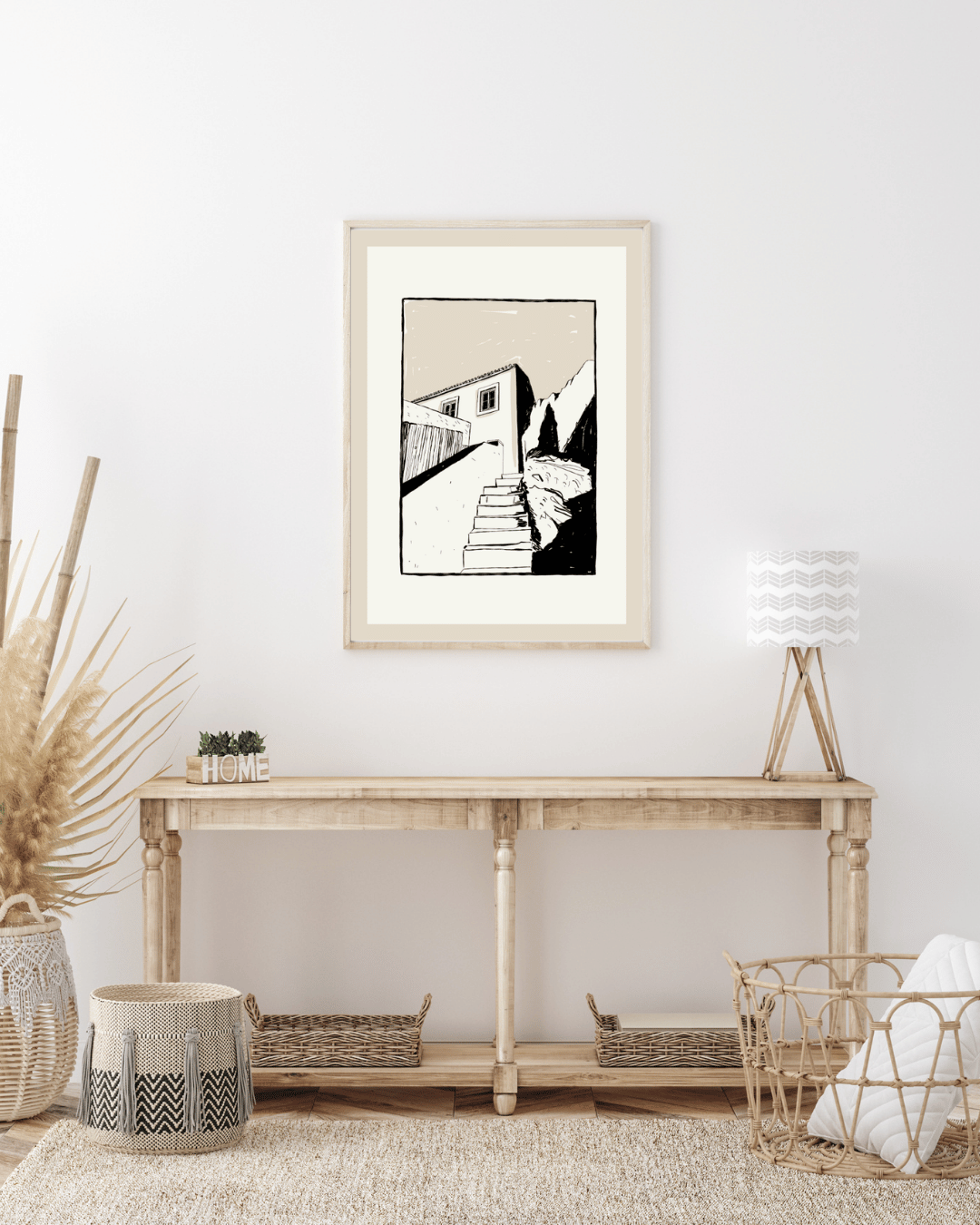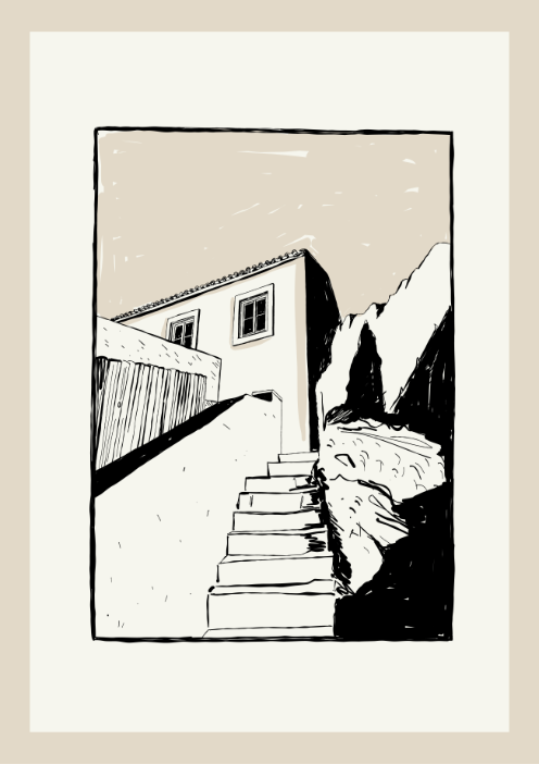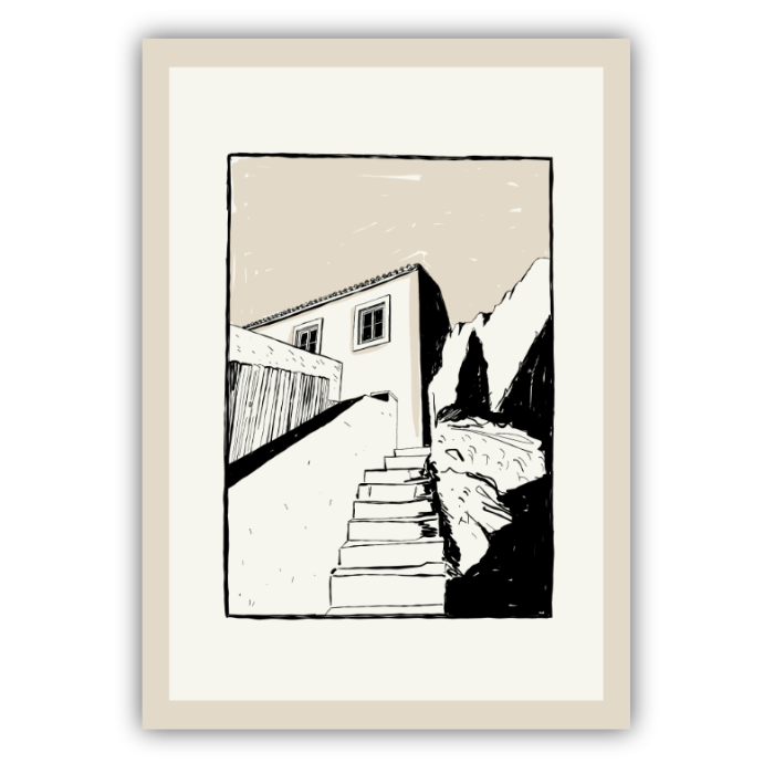 Minimalistyczny plakat z motywem architektury to subtelna dekoracja ściany dla miłośników prostoty, przestrzeni i spokojnych kompozycji. Czarno-beżowa ilustracja przedstawiająca schody prowadzące do domu tworzy wyjątkowy klimat – lekko nostalgiczny, ale jednocześnie nowoczesny.