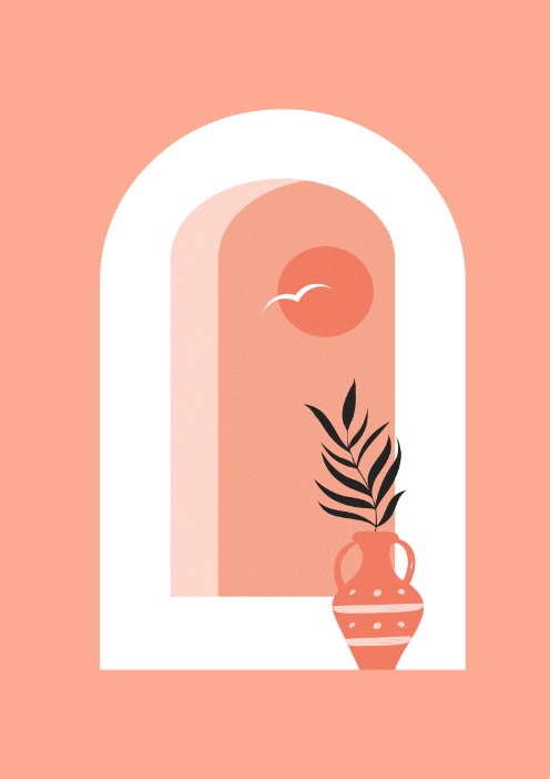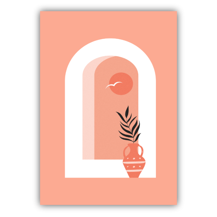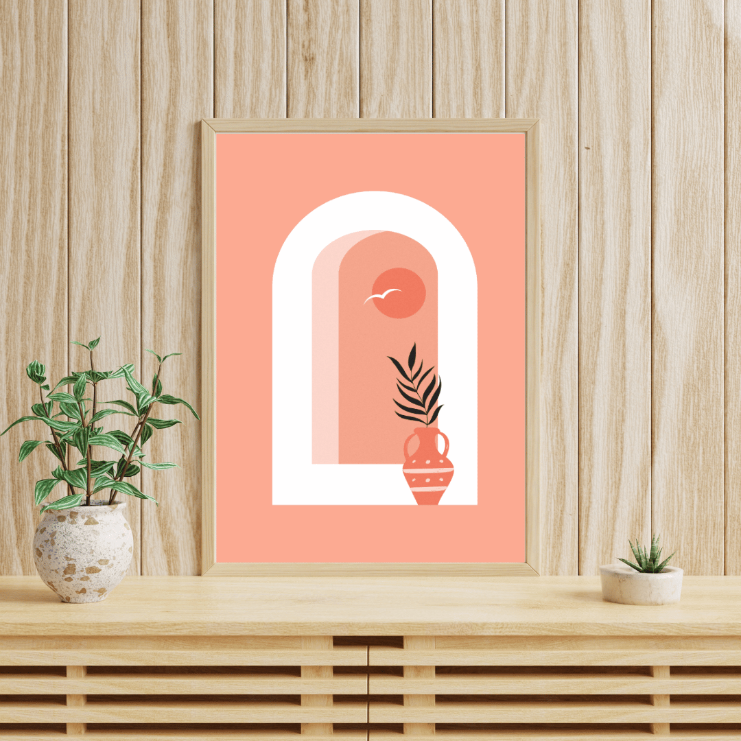 Minimalistyczny plakat inspirowany architekturą śródziemnomorską i ciepłym klimatem południowych krajobrazów. Delikatny motyw łuku, zachodzącego słońca oraz ceramicznego dzbana z rośliną tworzy harmonijną kompozycję, która wprowadza do wnętrza spokój i przytulność.Ciepłe odcienie pomarańczy i beżu nawiązują do kolorów zachodu słońca nad morzem, dzięki czemu plakat idealnie pasuje do wnętrz w stylu minimalistycznym, boho, skandynawskim oraz nowoczesnym.