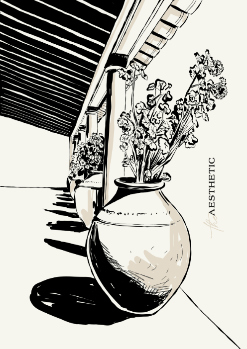 Ten plakat to subtelna gra światła i cienia, zamknięta w minimalistycznej, czarno-białej ilustracji. Scena dzbana z kwiatami ustawionego wzdłuż arkadowego krużganku wprowadza harmonię, elegancję i lekkość do każdego wnętrza. Styl line art podkreśla estetykę prostoty i naturalnego piękna. Plakat doskonale wpisuje się w nowoczesne, skandynawskie i śródziemnomorskie aranżacje.