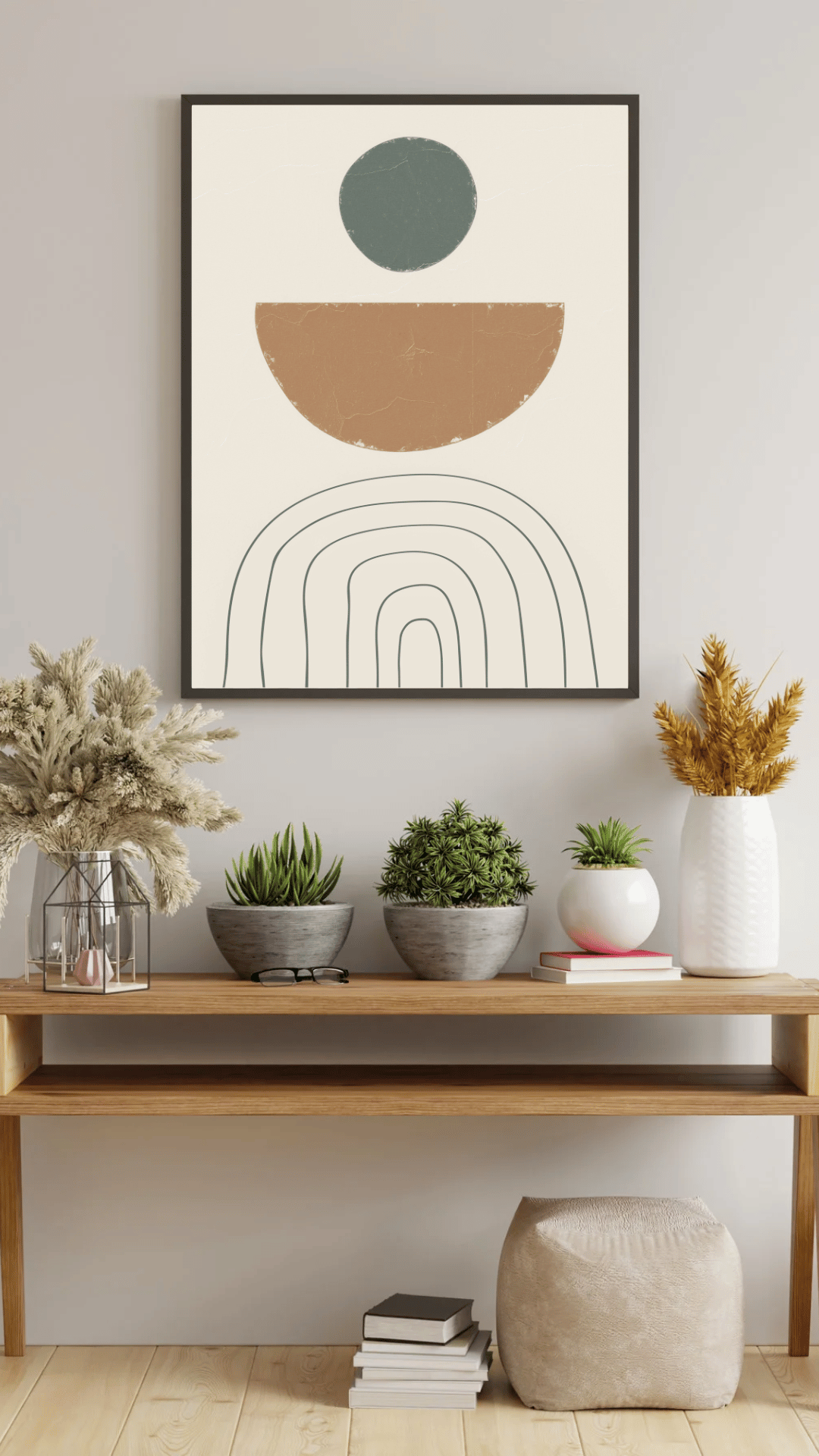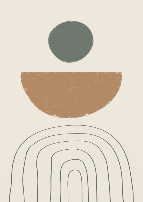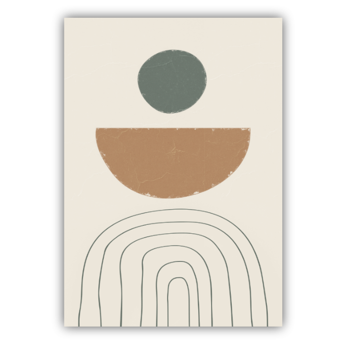 Minimalistyczny plakat geometryczny inspirowany harmonią form i spokojną estetyką nowoczesnych wnętrz. Proste kształty – koło, półkole oraz subtelne linie – tworzą elegancką kompozycję, która wprowadza do przestrzeni równowagę i lekkość.