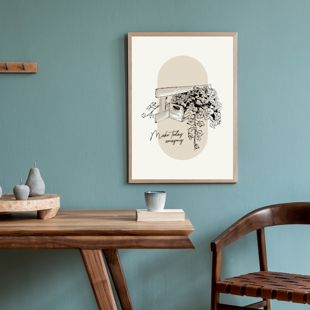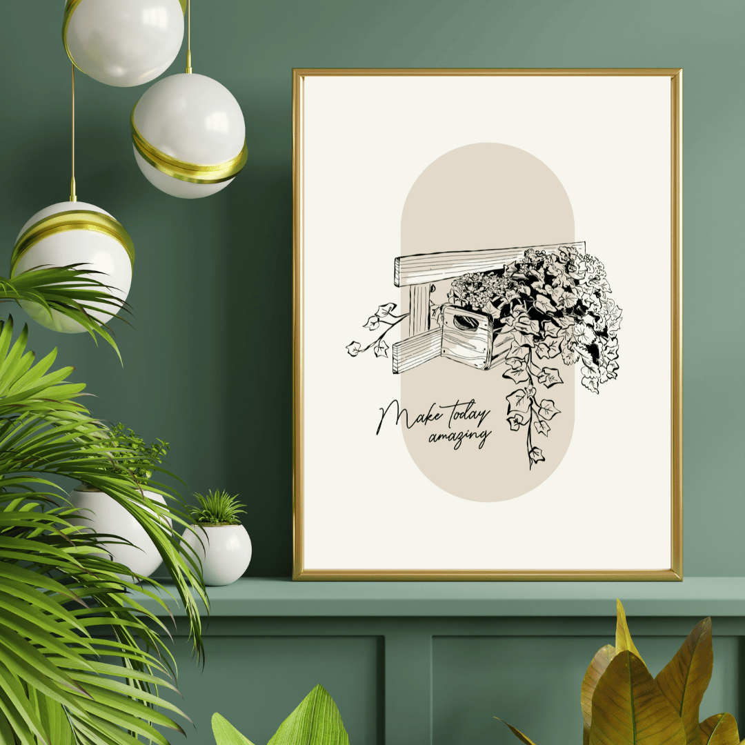 Plakat Make Today Amazing to subtelna, ale niezwykle inspirująca dekoracja ścienna, która wprowadza pozytywną energię do Twojej przestrzeni. Ilustracja z drewnianym stelażem, skrzynką i roślinnością na neutralnym tle symbolizuje harmonię, naturę i codzienną radość z małych rzeczy.