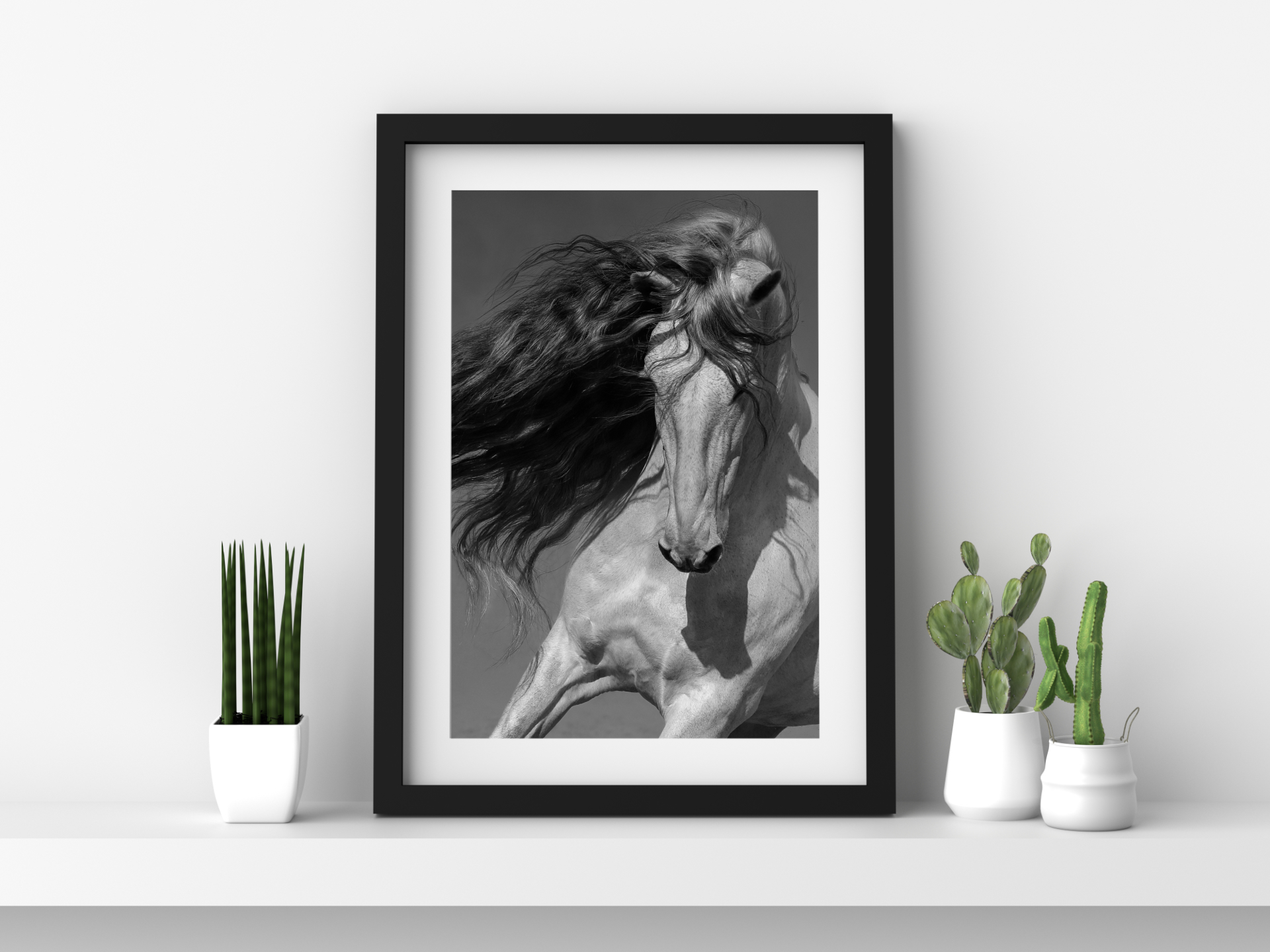 Dodaj do swojego wnętrza wyjątkowy akcent, który łączy dzikość, wolność i piękno natury. Plakat przedstawiający konia z rozwianą grzywą uchwyconego w ruchu to wyrazisty symbol siły, niezależności i harmonii. Czarno-biała stylistyka podkreśla detale i nadaje mu ponadczasowego charakteru, doskonale komponując się z nowoczesnymi oraz klasycznymi wnętrzami.