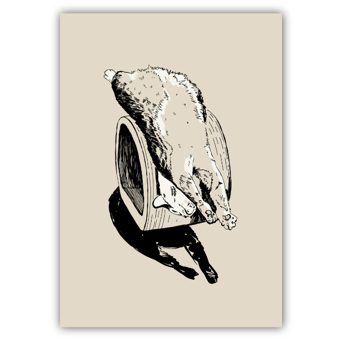 Plakat utrzymany jest w czarno-beżowej kolorystyce, co nadaje mu przytulnego, a zarazem nowoczesnego charakteru. Styl to połączenie humoru, minimalizmu i graficznej lekkości – idealne dla osób ceniących design z dystansem.