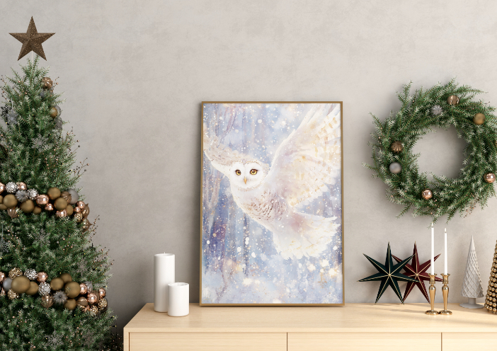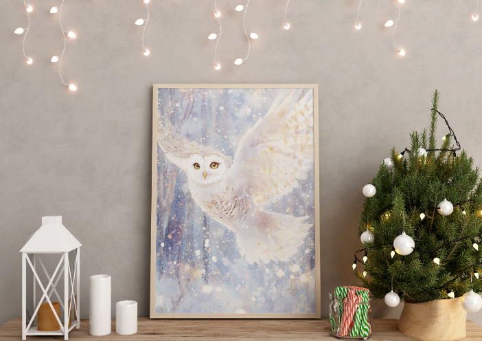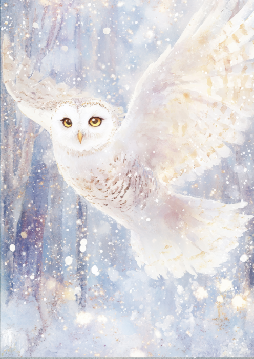 w otoczeniu lekkiego, migoczącego śniegu. Jej hipnotyzujące, złote oczy i delikatnie cieniowane pióra tworzą harmonijną kompozycję pełną lekkości, magii i zimowego blasku.