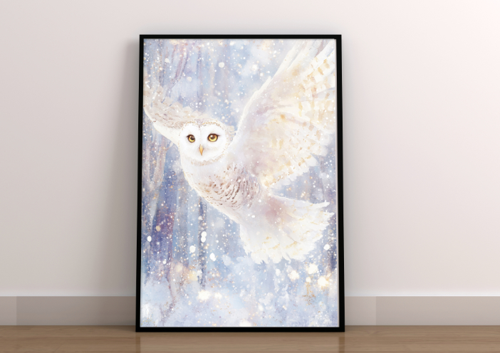 Plakat „Biała Sowa w Zimowym Locie” to zachwycająca, akwarelowa ilustracja przedstawiająca majestatyczną sowę sunącą przez zimowe powietrze,