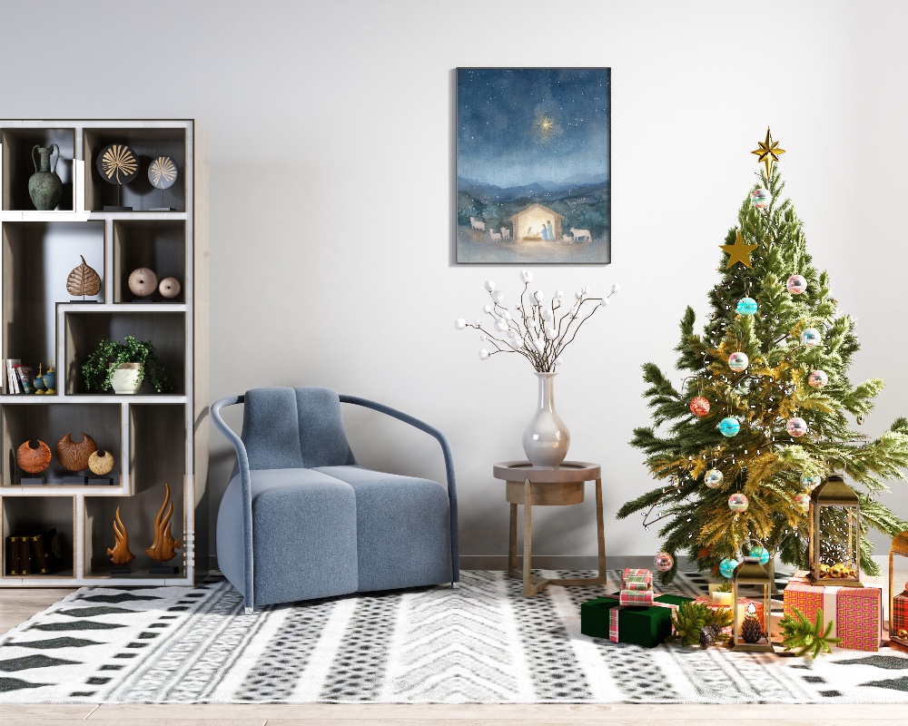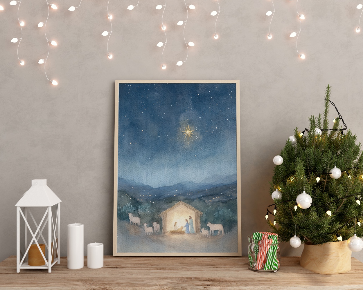 Plakat Światło Szopki utrzymany jest w delikatnym, akwarelowym stylu, który łączy tradycyjną symbolikę z nowoczesną, minimalistyczną estetyką. Plakat doskonale komponuje się z naturalnymi ramami i jasnymi wnętrzami, dodając im przytulności i elegancji.