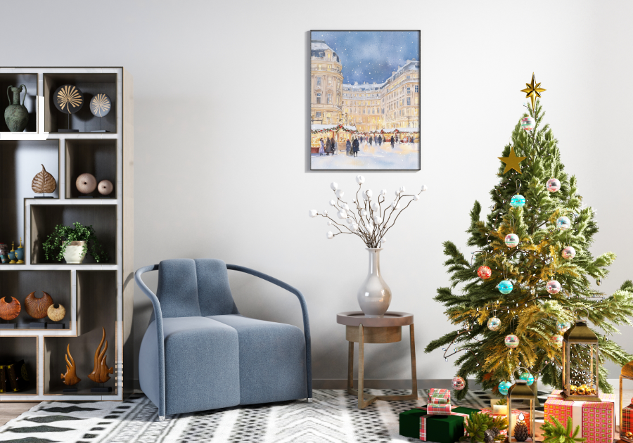 Dzięki subtelnym akwarelowym kolorom, połączeniu złamanej bieli, beżu, granatu i ciepłego światła lamp, ilustracja wprowadza do wnętrza elegancję, harmonię oraz wyjątkowy klimat świąt. Ten plakat zimowy świetnie sprawdza się w aranżacjach skandynawskich, klasycznych, nowoczesnych i glamour, dodając pomieszczeniu przytulności i blasku.