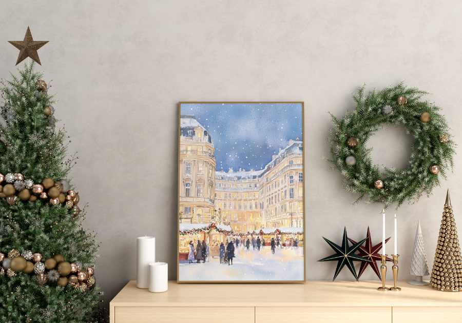 Plakat Świąteczny Rynek Zimowy przedstawia nastrojową, akwarelową scenę tętniącego życiem jarmarku bożonarodzeniowego, otoczonego elegancką architekturą klasycznych kamienic. Jasne światła witryn, miękkie refleksy odbijające się w śniegu oraz delikatnie prószące płatki tworzą magię zimowego wieczoru w wielkim mieście. To plakat, który oddaje esencję świątecznej atmosfery: ciepło, ruch, światło i radość wspólnego spędzania czasu.